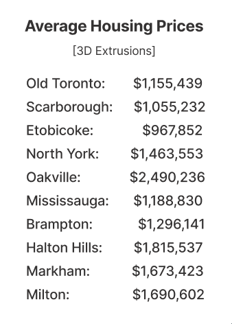 For this map I used a combination of a Choropleth Map and 3D Extrusion. The principle of colour was used in the base of the design with a choropleth map which showed the population density of select cities and towns in the GTA; as the population count increased, the colour of the specific area darkened. And the principle of proportion/size was used in the second variable of the map; the average housing prices.